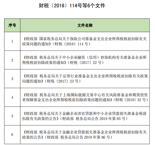 四、《财政部 国家税务总局关于保险公司准备金支出企业所得税税前扣除有关政策问题的通知》(财税〔2016〕114号)等6个文件规定的准备金企业所得税税前扣除政策到期后继续执行,详见附件2。