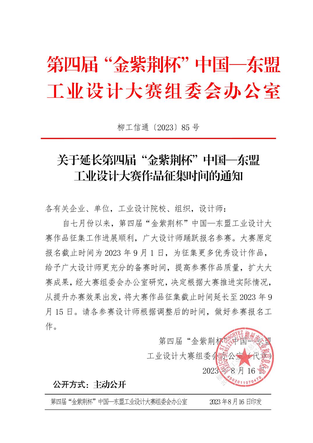 自七月份以来,第四届“金紫荆杯”中国—东盟工业设计大 赛作品征集工作进展顺利,广大设计师踊跃报名参赛。大赛原定 报名截止时间为2023年9月1 日,为征集更多优秀设计作品, 给予广大设计师更充分的备赛时间,提高参赛作品质量,扩大大 赛成果,经大赛组委会办公室研究,决定根据大赛推进实际情况, 从提升办赛效果出发,将大赛作品征集截止时间延长至2023年9 月15日。请各参赛设计师根据调整后的时间,做好参赛报名工作。