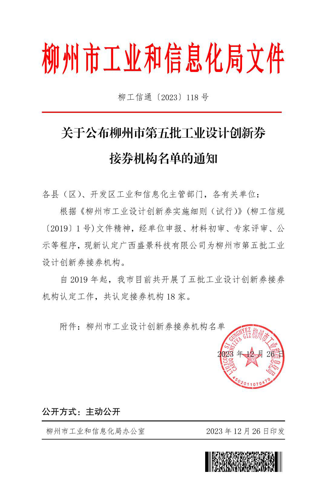 根据《柳州市工业设计创新券实施细则(试行)》(柳工信规〔2019〕1号)文件精神,经单位申报、材料初审、专家评审、公示等程序,现新认定广西盛景科技有限公司为柳州市第五批工业设计创新券接券机构。